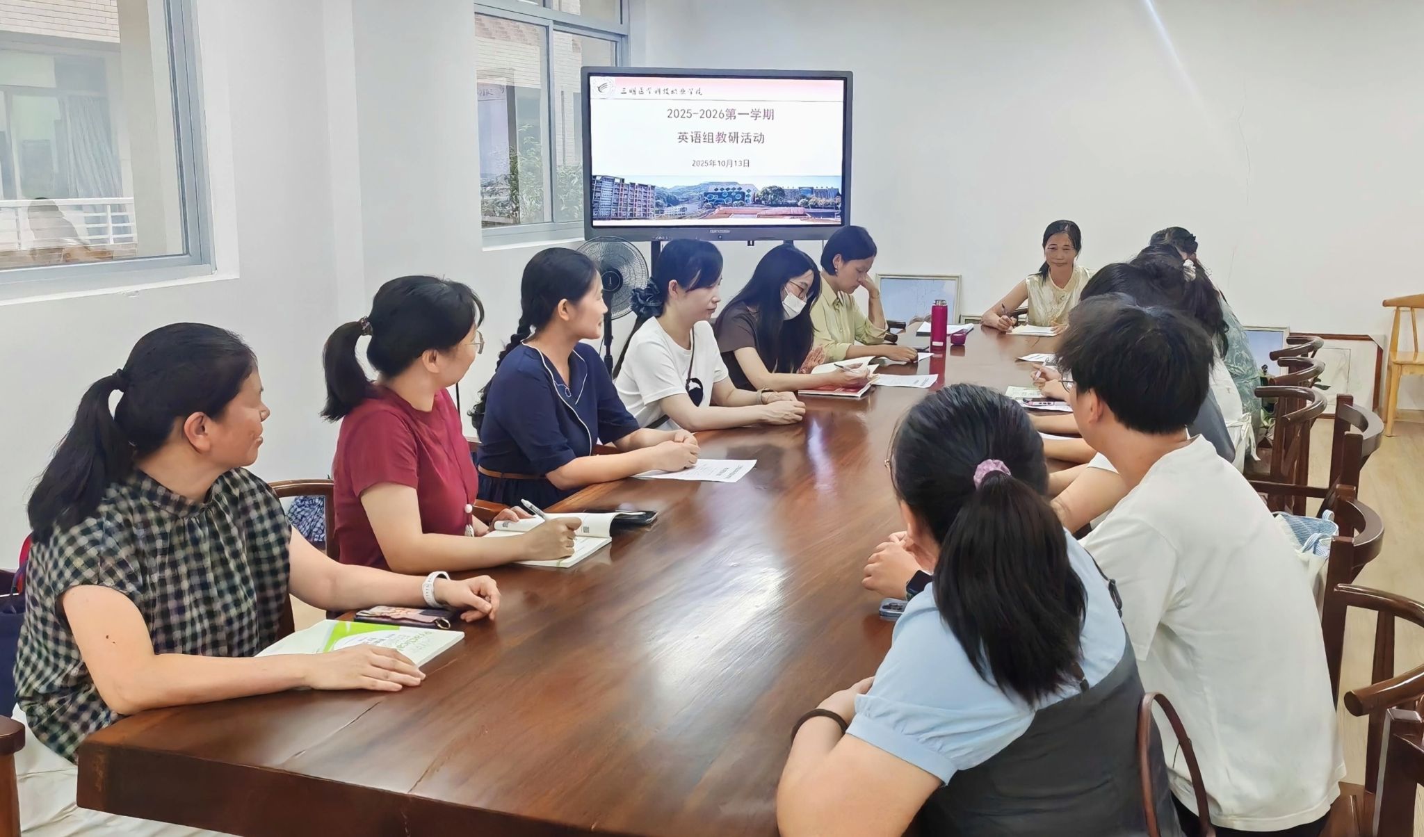 2025年10月13日下午,英语教研室在图书馆210室开展英语教研组活动,活动由教研室主任陈冬凤主持,全体组员参与。