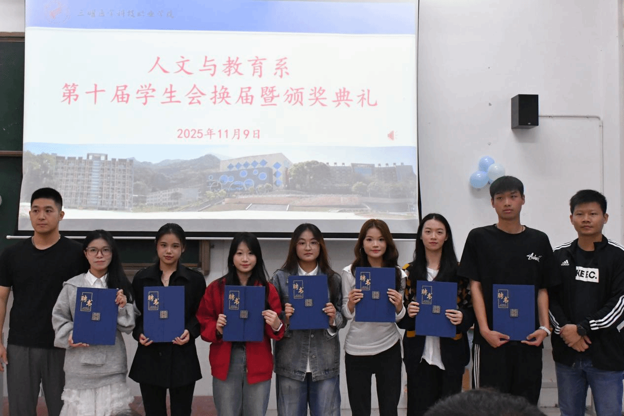 人文与教育系学生会主席胡曦妍代表第九届学生会做工作总结。系团委书记兼学工办主任林少舟在讲话中,对往届学生会干部们的辛勤工作给予了充分的肯定,并鼓励新一届学生会干部以饱满的热情和务实的态度投入到接下来的工作中。随后,林少舟老师与杨镇嵘老师为第九届学生会干部颁发任职聘书并合影留念。
