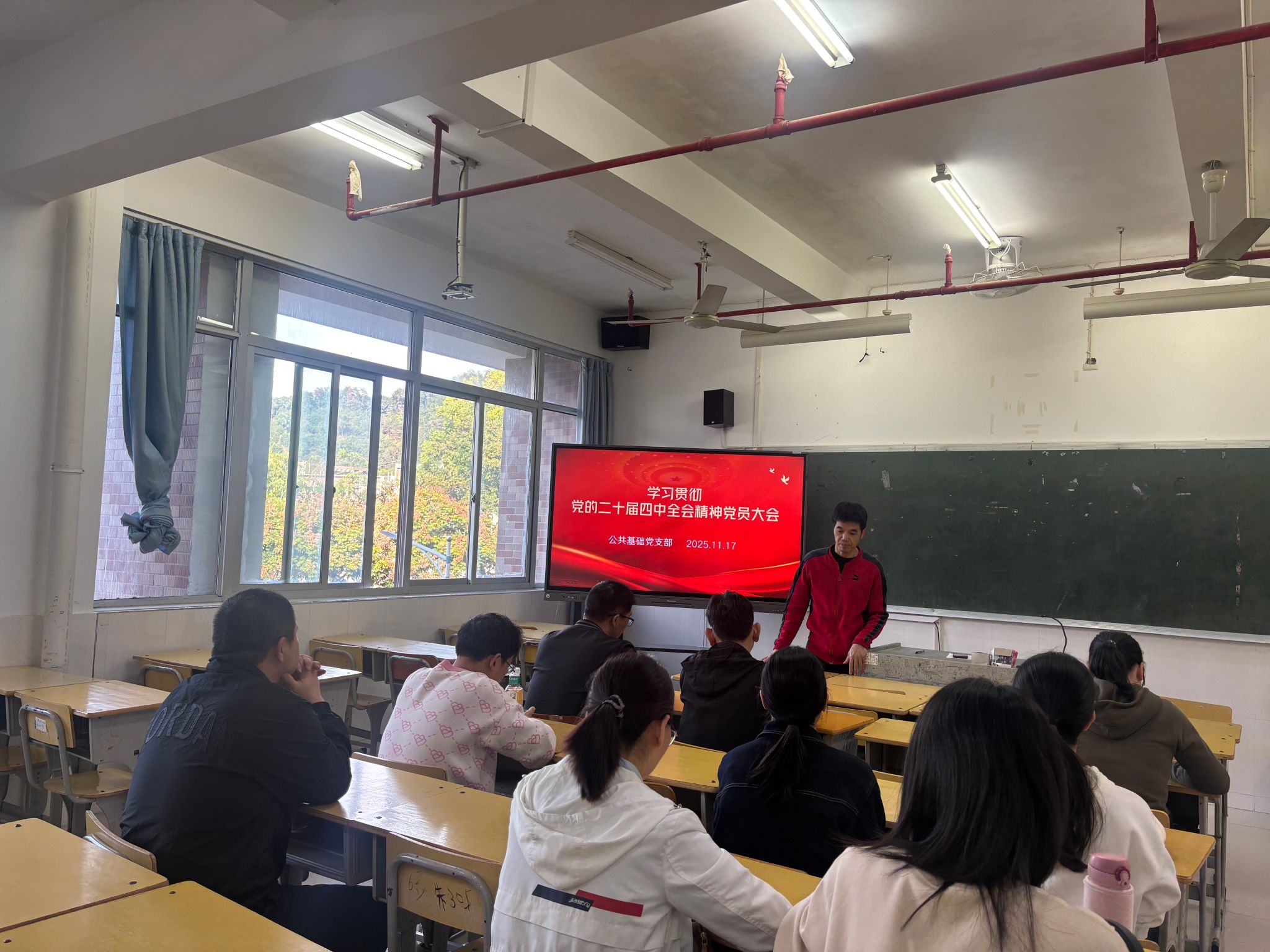 11月17日下午,公共基础党支部于朱子楼201教室召开学习贯彻党的二十届四中全会精神专题党员大会,支部全体党员参会,聚焦全会精神核心要义与实践要求开展集中学习。