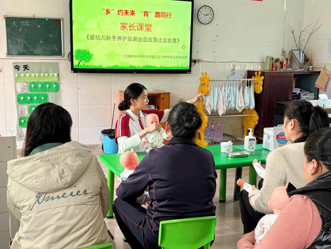 党支部学生预备党员、入党积极分子及托育专业优秀学生代表们为乡村家长普及分月龄照护科学育儿知识,结合秋冬季节特点,系统讲解鼻出血应急止血技巧,通过模拟演示拆解海姆立克急救法操作要点,让家长快速掌握应急救护技能。