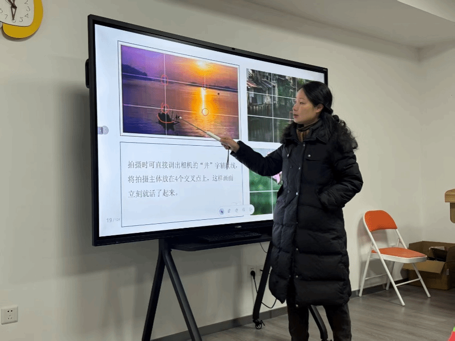 刘勤老师从“相机与手机的握持方法”等基础操作讲起,重点解析了新闻摄影的构图逻辑。她以“黄金分割法”“三分法则”为核心,结合大量图片,详细讲解了如何通过构图避免“顶天立地”“头顶长角”等常见摄影误区,让同学们理解了“画面留白”等技巧对提升视觉舒适度的作用。