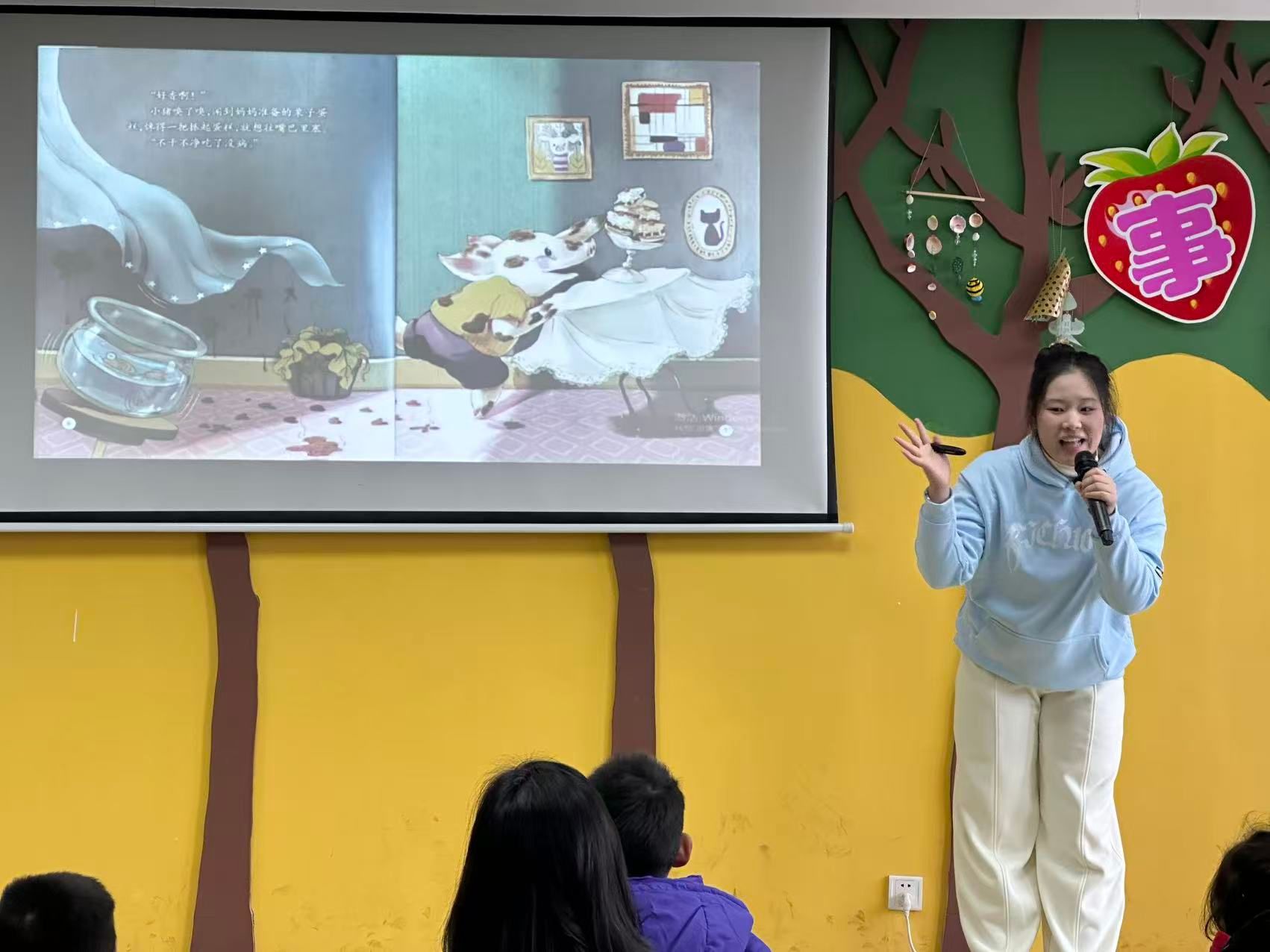 活动围绕经典绘本《小猪洗澡记》展开。来自22早教五年专2班的杜云同学以生动活泼的讲述,带领孩子们进入小猪的趣味洗浴世界。绘本故事不仅传递了卫生习惯的培养,更激发了孩子们对小猪形象的喜爱与想象。