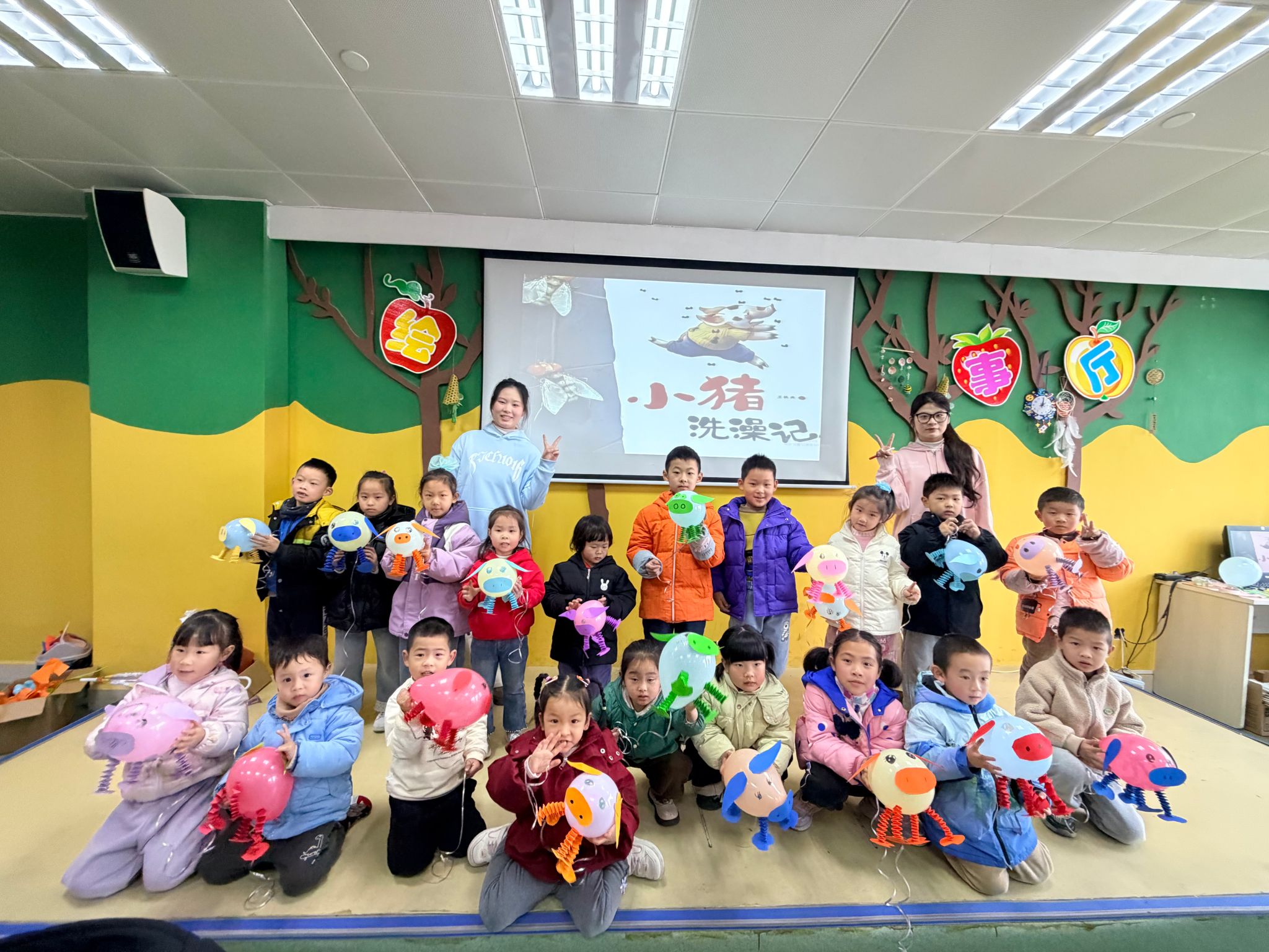 绘本阅读意犹未尽,手工创作接力精彩。24早教2班入党积极分子郑睿茜同学指导家长与孩子们制作“气球小猪”。彩色的气球在巧手中变成一只只憨态可掬的小猪,孩子们专注投入,家长耐心协助,亲子合作间洋溢着温馨与成就感。现场欢笑不断,一只只气球小猪成为连接亲子情感的创意纽带。